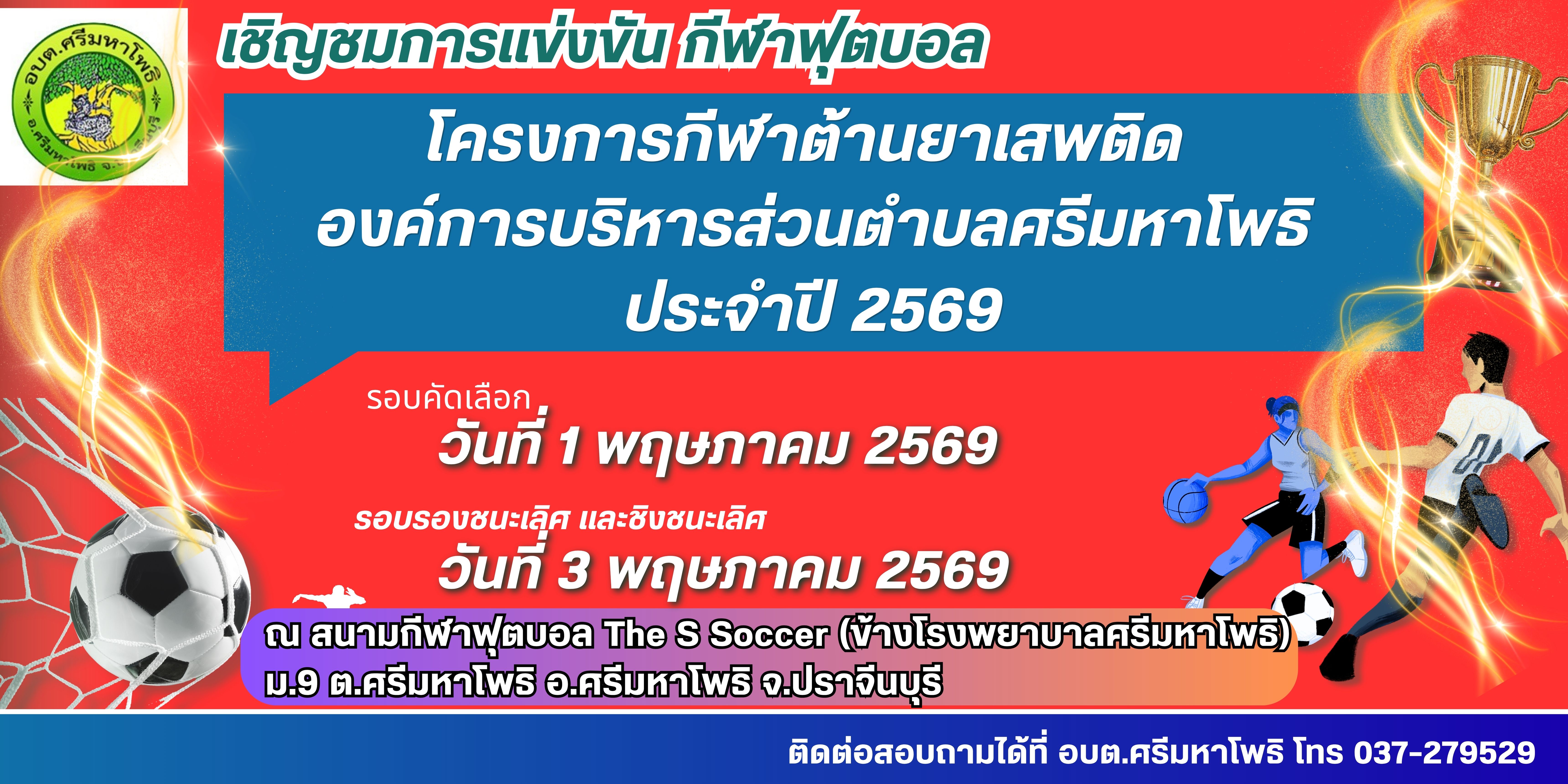 เชิญชมการแข่งขันกีฬาฟุตบอล โครงการกีฬาต้านยาเสพติดองค์การบริหารส่วนตำบลศรีมหาโพธิ ประจำปี 2569